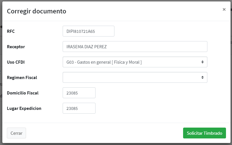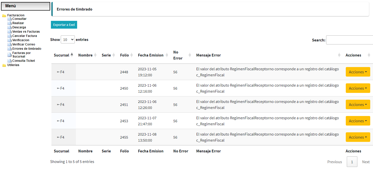 - Mensaje de error: Muestra la descripción del error de timbrado.