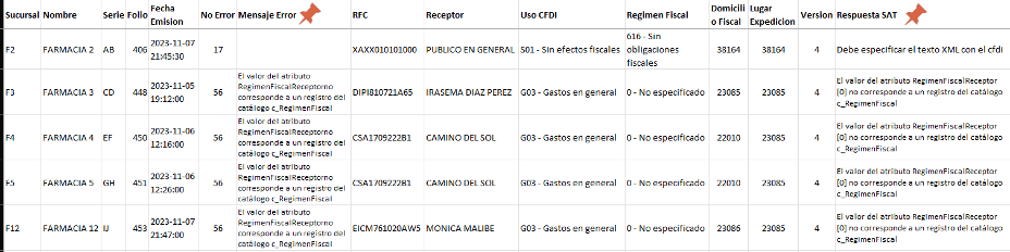 Se cuenta con la opción de exportar el reporte a Excel, seleccionando el icono Importar Excel, para revisar a detalle el listado de las facturas con error.