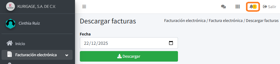 Para descargar el archivo, dé clic en la notificación; se abrirá el listado de notificaciones de clic en el bloque para descargar un archivo comprimido con todas las facturas correspondientes a ese día que se seleccionó previamente en el calendario.
