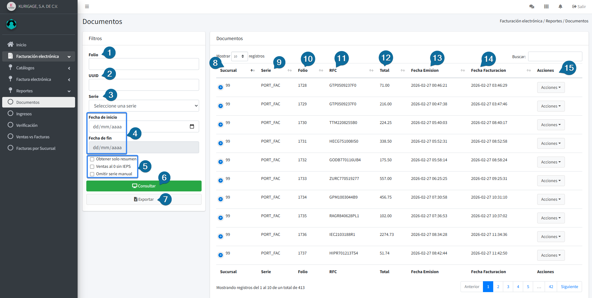 - Serie: Muestra la serie asignada para esa sucursal ya sea para facturas o notas de crédito.