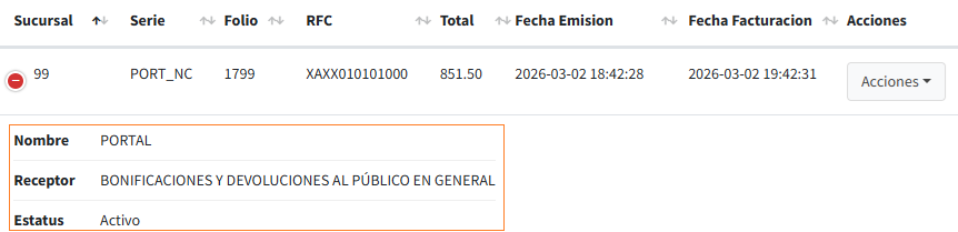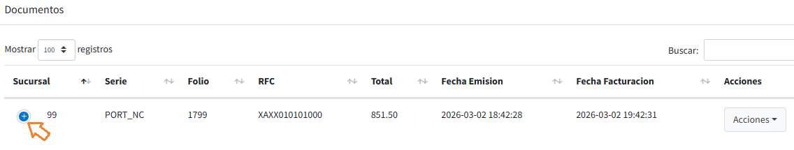 Acciones: botón con acciones adicionales a realizar en la factura o nota de crédito.