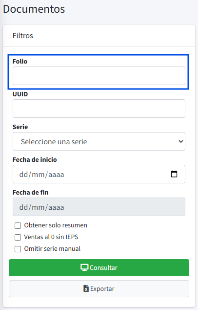 - No. Folio: campo para ingresar el número de folio de la factura a consultar