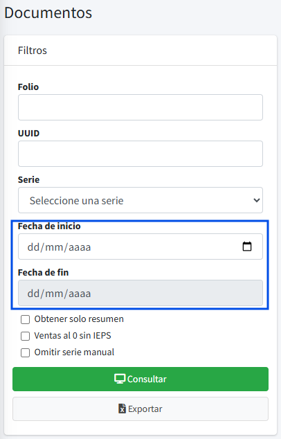 - Fecha inicio - Fecha fin: Ingresar el rango de fechas del periodo a consultar en el reporte.