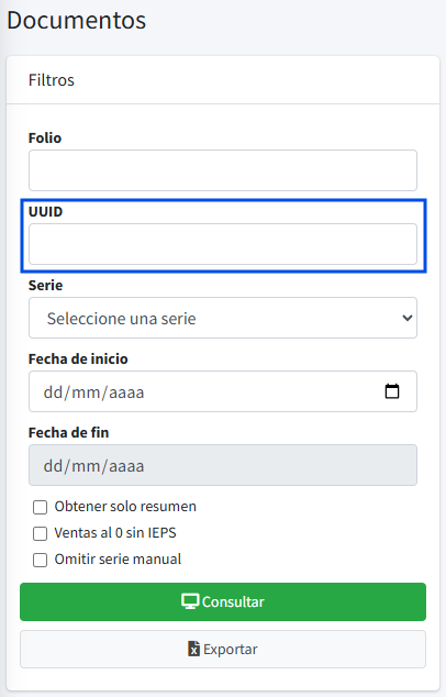 Ingrese el campo "UUID" o "folio fiscal único emitido" el dato que desea consultar y de clic en el botón Consultar . Esta consulta únicamente es para visualizarlo en pantalla.