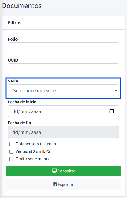 - Serie: campo desplegable para seleccionar la serie de facturación que se desea consultar.