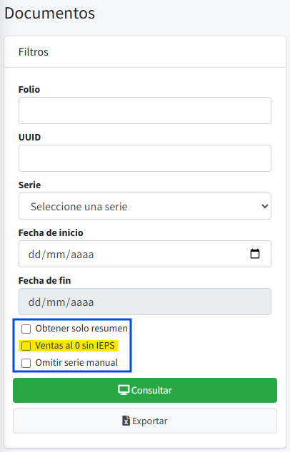 Para generar el reporte sin incluir en el monto el impuesto IEPS, ingrese sus parámetros de búsqueda (fechas, estatus, serie, etc.) y marque la casilla de la opción Ventas al 0 sin IEPS.