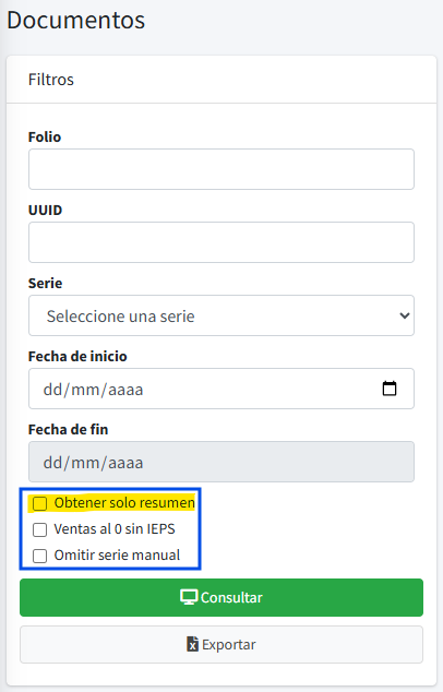 Para generar el reporte incluyendo en el monto el impuesto IEPS, ingrese sus parámetros de búsqueda (serie, fechas, etc.) y deje la casilla desmarcada de la opción Ventas al 0 sin IEPS.