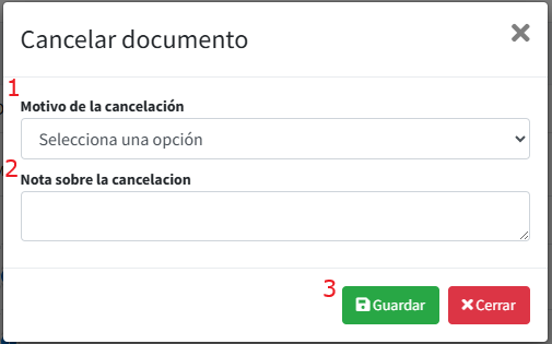 - Nota sobre la cancelación: Campo para agregar notas adicionales