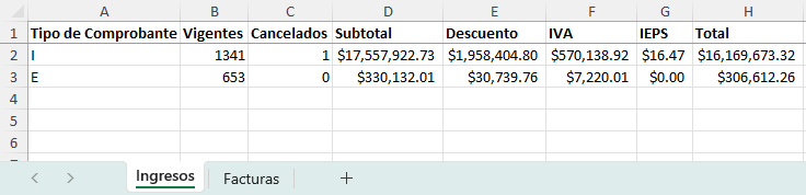 El sistema generará un archivo con un desglose más detallado de los ingresos en formato de hoja de cálculo de Excel que se descargará a su computadora.