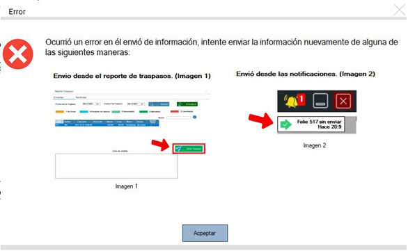 Si los traspasos no pudieron ser enviados se mostrará el siguiente mensaje.
