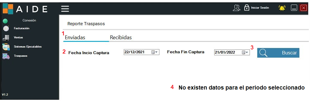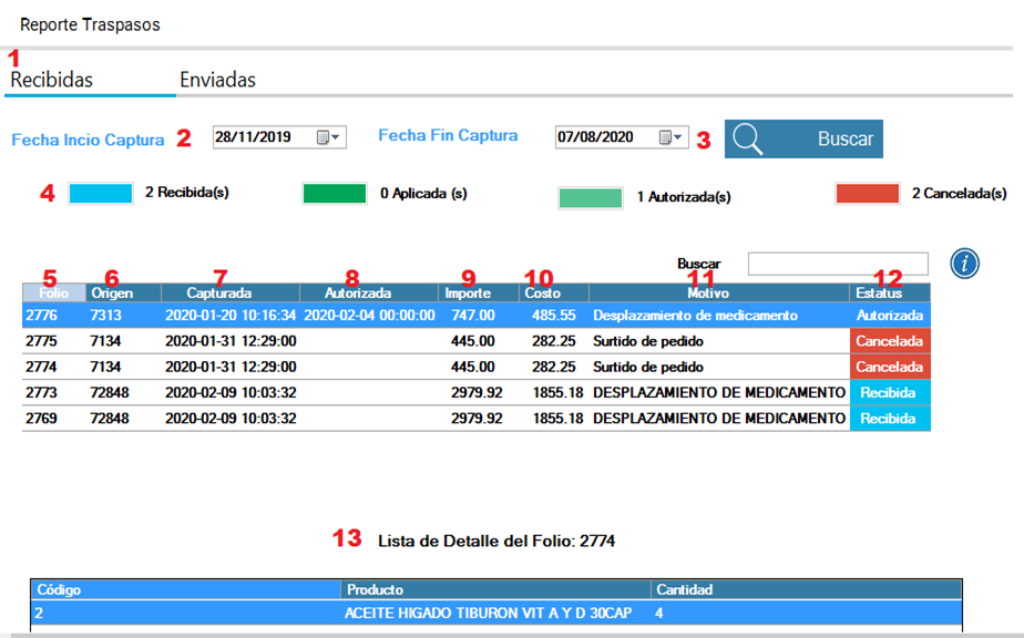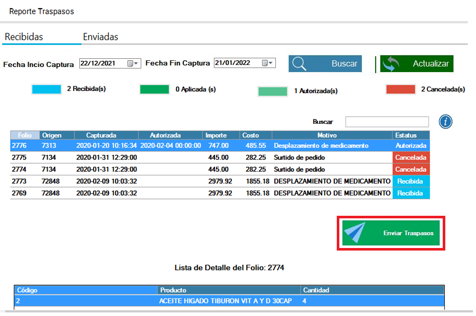 - Recibidas/Enviadas: Botones que permiten seleccionar traspasos enviados o recibidos según si deseamos lo que deseemos revisar.