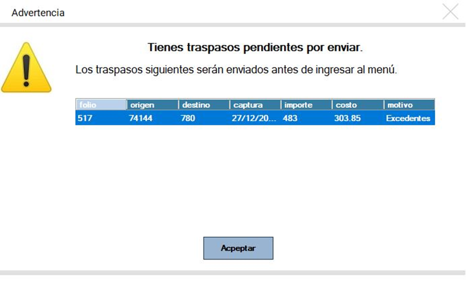 En caso de que se tenga un Traspaso pendiente de enviar, el usuario presionara el botón de Aceptar para poder continuar al menú de Capturar traspaso, y los traspasos pendientes serán enviados.