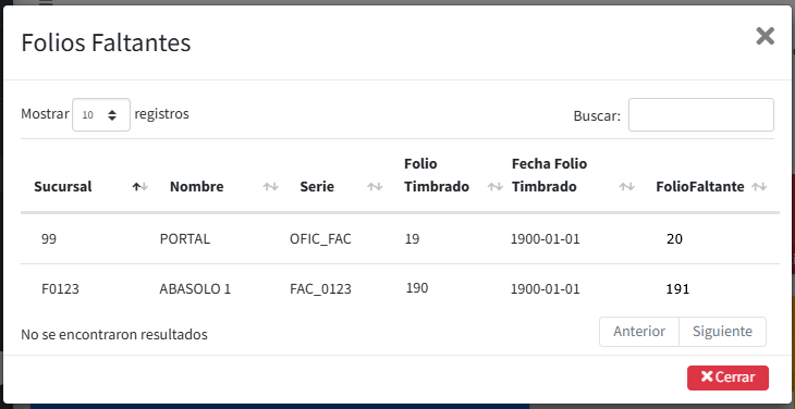 . Se mostrará la siguiente ventana con la información de los folios faltantes no timbrados.