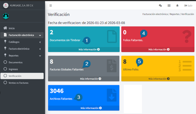 En esta sección se visualizará el número de facturas que se deberían de tener y si existiera algún faltante.