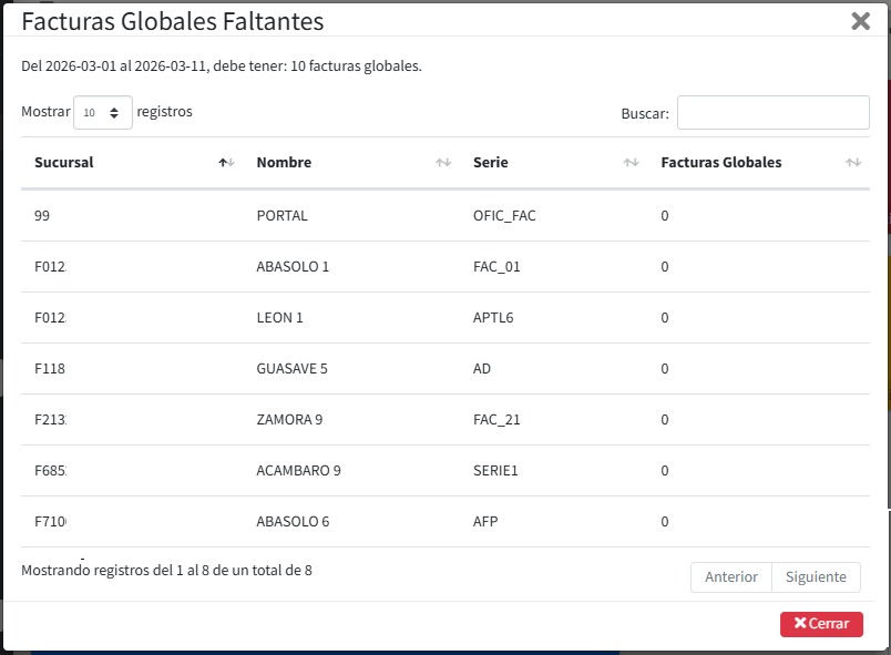 . Se mostrará la siguiente ventana con la información de las facturas globales faltantes.