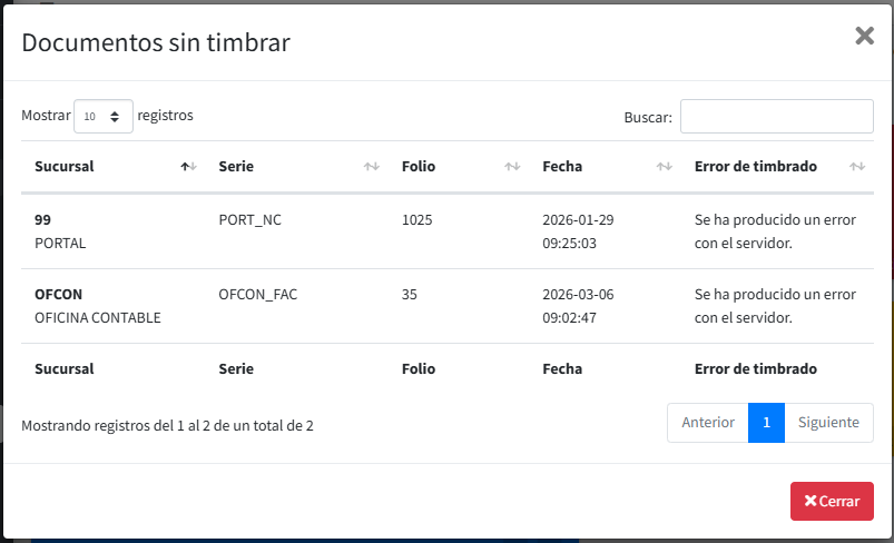 . Se mostrará la siguiente ventana con la información de los documentos no timbrados y el detalle del error que impide el timbrado.