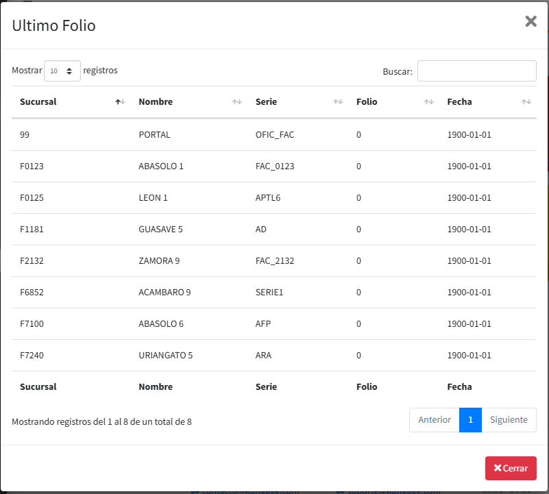 . Se mostrará la siguiente ventana con la información del ultimo folio timbrado de las sucursales.